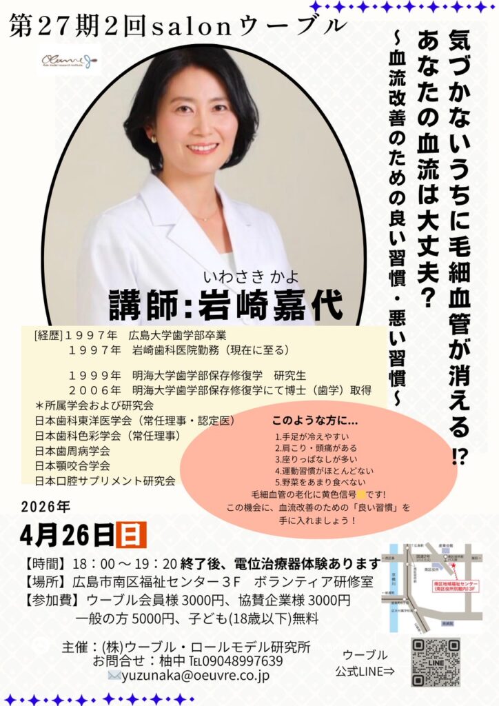 - 【第27期サロンウーブル】血流改善による健康へのステップアップ 岩崎嘉代(いわさきかよ)氏3月!寒かったり暖かかったり、気温差もあったりしますが季節は春へ向かう期待が心を弾ませます。冬の寒い時期に肩に力が入り体もキュッと縮こまっていた季節も終わりを告げようとしてます。夏の疲れもあるように冬の疲れってある気がし […]