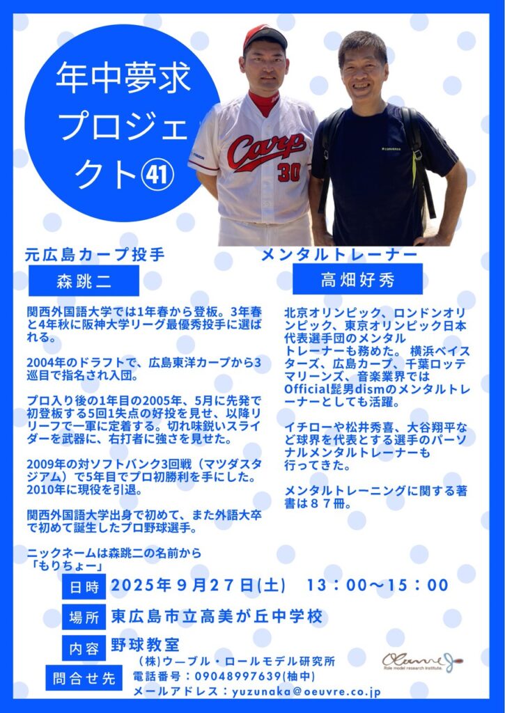 【9/27(土)開催】元カープ投手とメンタルトレーナーが語る「年中夢求プロジェクト」でホンモノの感動を