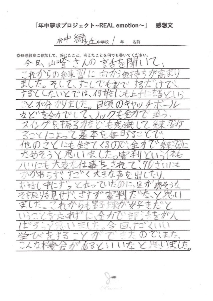 山崎さんの「審判員」の姿に、子どもたちは「プロ」を感じたことと思います。そのホンモノの審判員は、ただ球種を判定するだけの人ではなく、一球一球をものすごい集中力と真剣さで判定してくださいました。「ホンモノ」の人に共通することの一つに「厳しいほどの真剣さ」を感じます。苦しいことや嫌なことがあると、人は簡単に逃げてしまう弱い生き物ですが(私もですが)「ホンモノ」になる人は、苦しいことから逃げずに立ち向かった先に喜びや成長があることを知っている。そこに早く到達するには、自分にも相手にも、厳しく、真剣に取り組むことが非常に重要だ、とわかっておられるのだと思います。その真剣な取り組みの積み重ねが実力となり、素晴らしい結果を生むのだと思いました。こうした「真剣な大人の姿」を子どもたちが肌で感じることも大切な体験であり、この活動の意味だと思うのです。